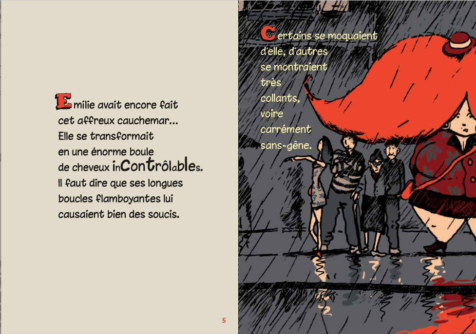 Emilie has a mane of red hair that plays tricks on her: washing it takes hours, if she has dandruff it’s like a snowstorm, and the only job she’s offered is as a sandwich board girl for a wig maker. Tired of it all, she leaves for Africa. But her wild mane leads the locals to mistake her for a goddess and take her prisoner. She manages to escape and meets Mortimer, a fashion designer with a moustache as flamboyant as Emilie’s hair. She becomes his muse and imposes her hairstyle on him.