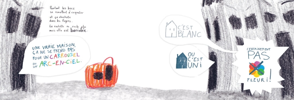 A small, colorful, slightly plump trailer travels the world. At the end of the day, it stops at the edge of a pretty village full of flowers. But immediately, rumors start flying in the village. Its wheels, its flower colors, and its roof without a chimney: everything is a reason to gossip… Yet the little trailer tries hard to be like everyone else. To put an end to the nasty gossip, it abandons its wheels and colors and has a chimney built. Until one day, it comes across a group of trailers passing through the village. Grayish, nailed to the ground, and disfigured by a chimney, its old friends mock the little trailer just as the pretty village in bloom did. Hurt, the little trailer is now determined not to let herself be influenced anymore. After a storm, she regains her flower colors, puts her wheels back on to avoid the rain, but keeps the chimney!