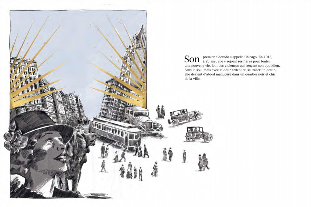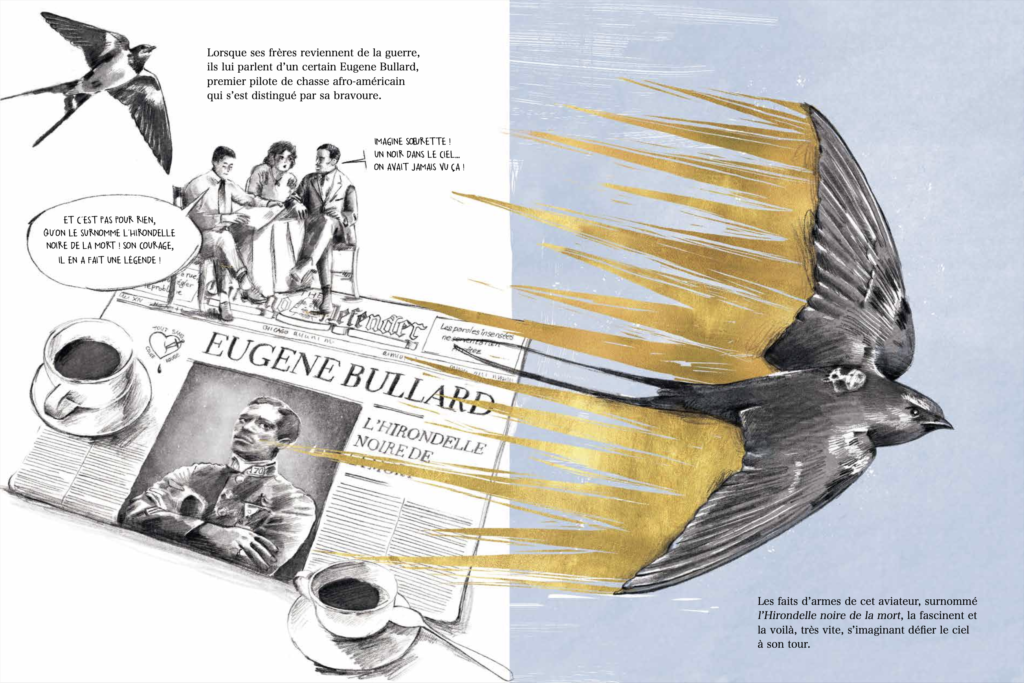 Première afro-américaine pilote d’avion, Bessie Coleman a déjoué tous les déterminismes. Née en 1890 dans les champs de coton, celle dont l’avenir est écrit d’avance en détourne le tracé, direction le ciel. Bravant la ségrégation, le racisme et son genre, la jeune femme traverse l’Atlantique pour aller au bout de sa passion. C’est en France qu’elle obtient son précieux sésame et en Europe qu’elle acquiert le statut de voltigeuse. Enfin reconnue dans son pays, elle enchaîne les exploits et décroche le surnom de Queen Bess ! Mais entre deux arabesques aériennes, son souhait le plus cher reste de mettre « des couleurs dans le ciel ». Le danger, dont elle fait fi, finit par la rattraper… Elle ne sera pas là pour assister à l’inauguration de l’école d’aviation de ses rêves, ouverte à tous, mais son nom, mémoire d’un courage hors norme, brillera à son fronton pour toujours.