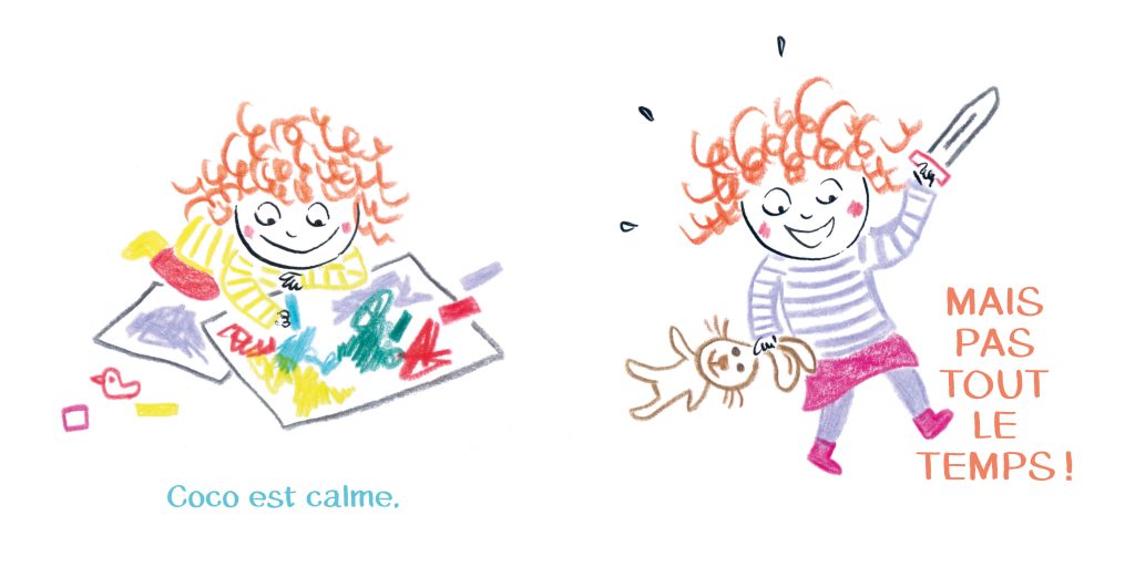 Elle s’appelle Coco. Quelquefois, elle est calme. Mais pas tout le temps. Elle aime la couleur rose. Mais pas seulement. Elle se sent parfois contente, et parfois en colère. Nos personnalités, nos goûts, nos humeurs : nous changeons ! Ne cherchons plus à nous faire entrer dans des cases, surtout si elles sont stéréotypées.