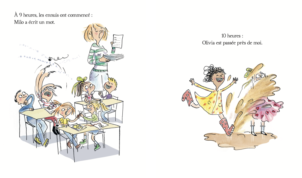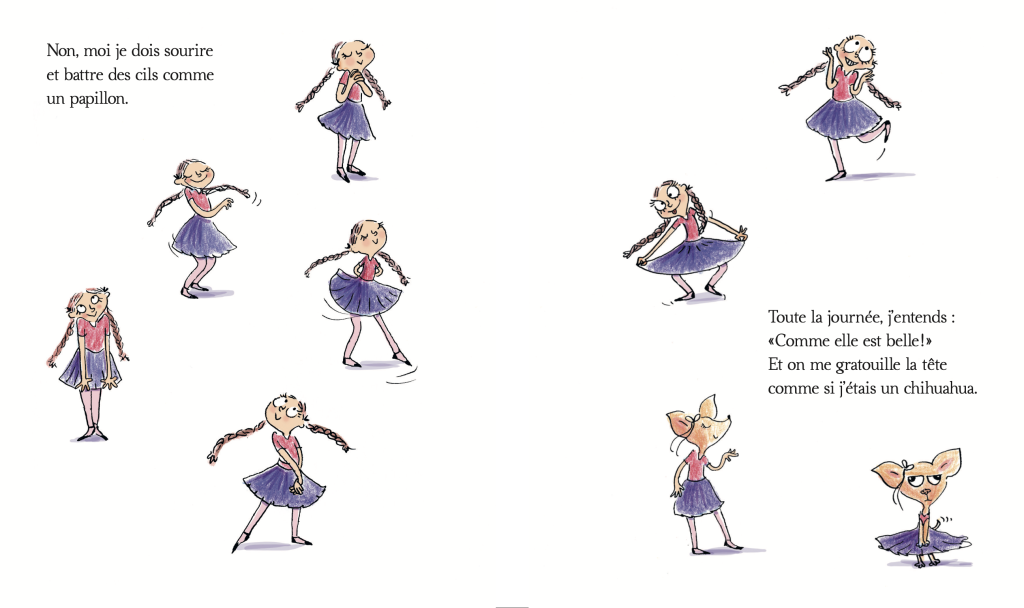 « J’aime PAS être belle. Mais tous les jours avant d’aller à l’école, Maman vérifie si : ma robe est bien repassée, mes cheveux bien coiffés, mes collants bien tirés, mes chaussures bien cirées. »