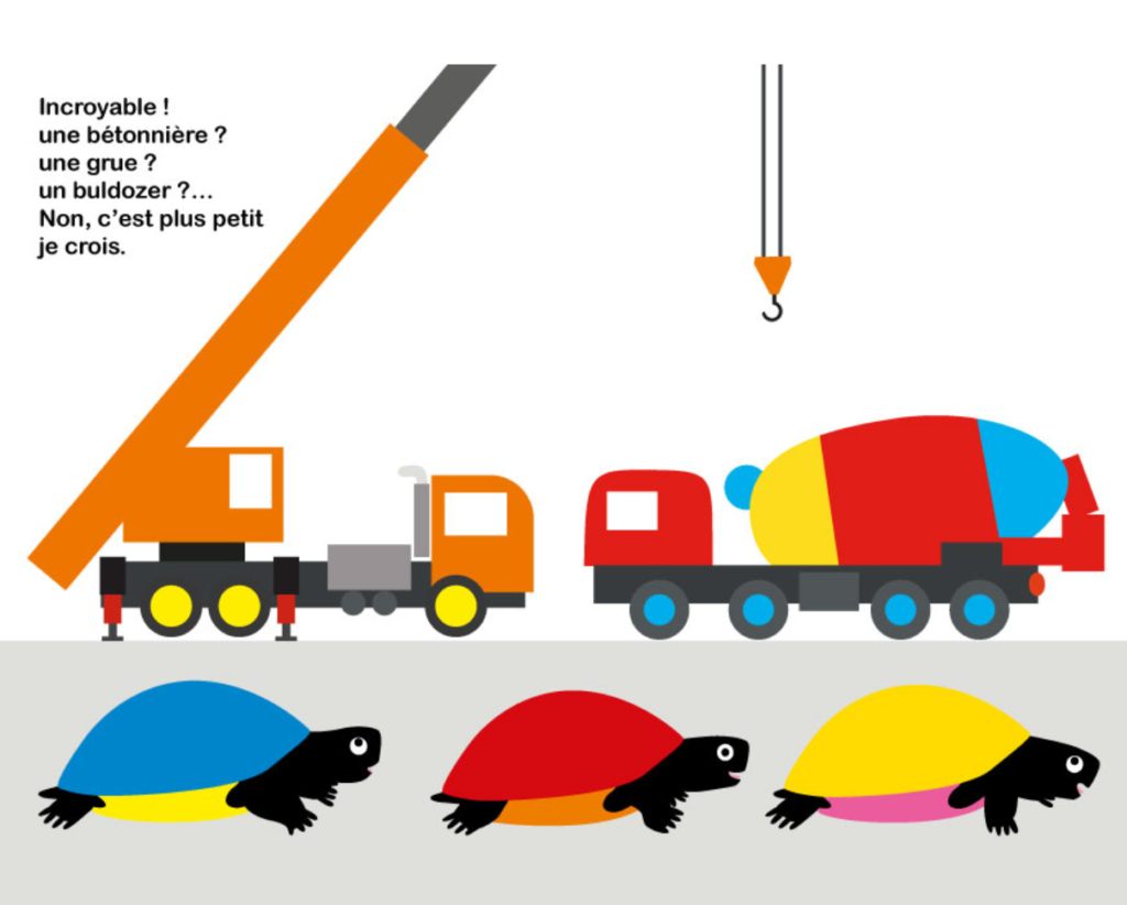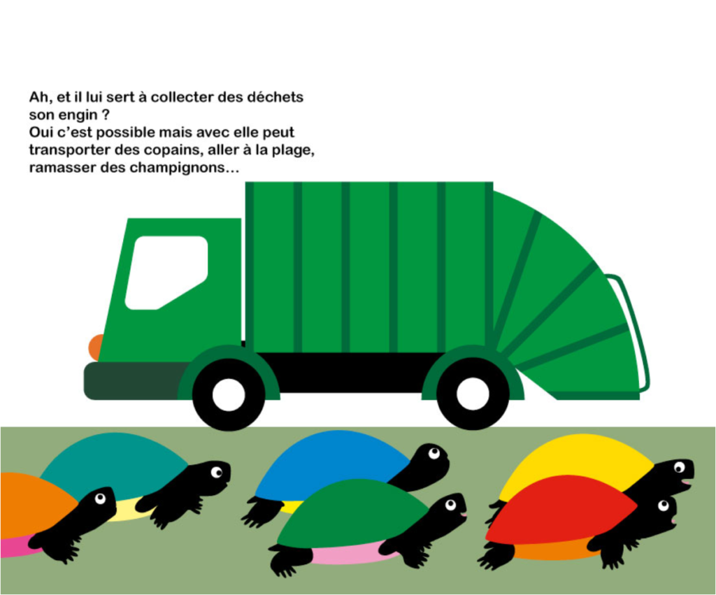Noémie la tortue a un nouvel engin ! Mais qu’est-ce que c’est ? Un tractopelle, une grue, une bétonnière ? Est-ce qu’elle peut aller dans les champs avec ? Sert-il à collecter les déchets ? Possible, avec, elle peut transporter des copains, aller à la plage, ramasser des champignons. Vous avez trouvé ?